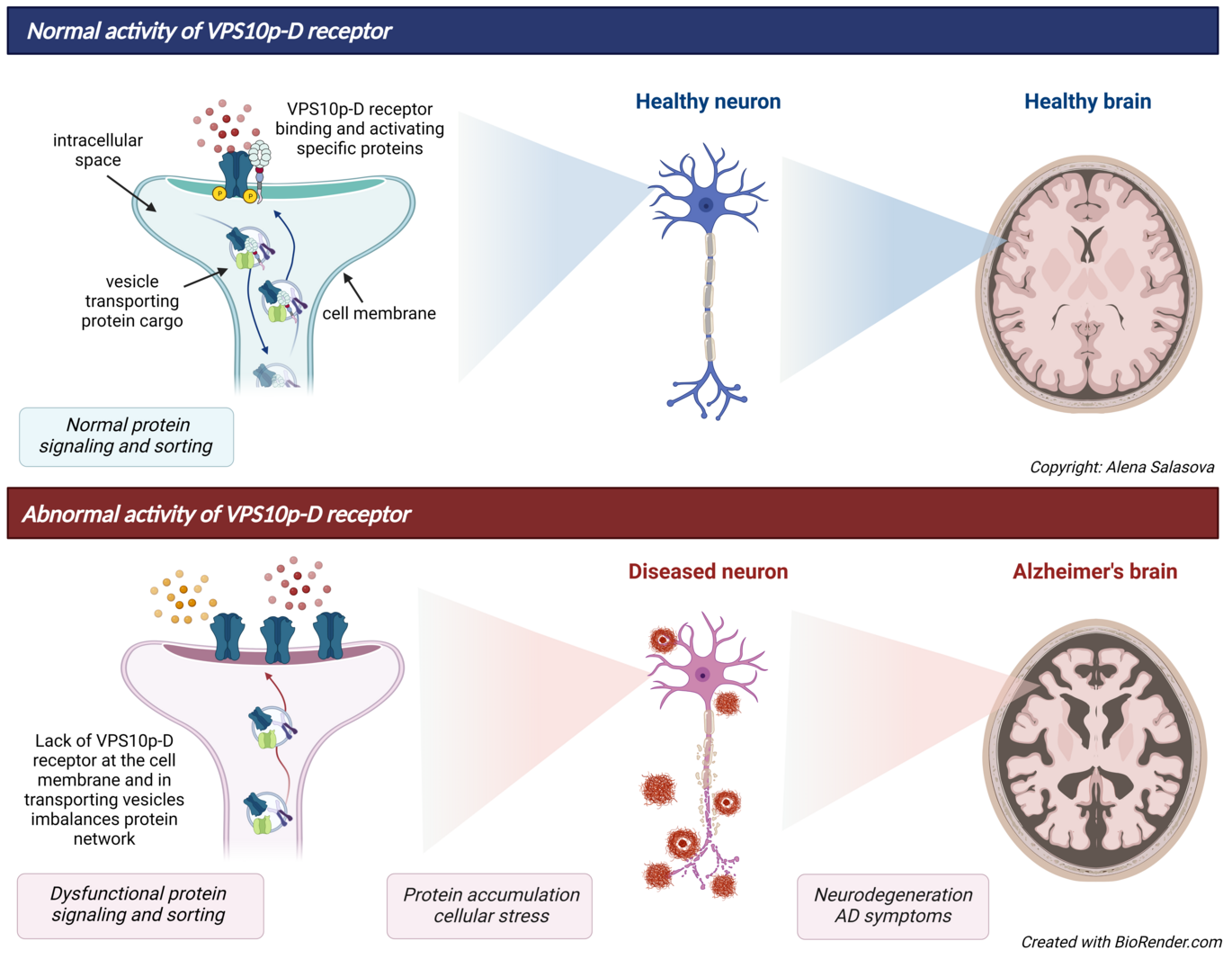 The review article highlights the involvement of a specific protein family called “VPS10p-domain receptors” in AD. This family consists of five members; SorLA, Sortilin, and Sorcs1-3, which are almost exclusively present in neuronal tissue. They are critical for multiple biological processes such as neuronal survival, cell death, glucose and lipid metabolism, and brain connectivity. Their specific roles differ; however, they are mostly responsible for cell-to-cell communication, and for the correct transportation of AD-related proteins within a neuron. If something goes wrong in these processes, the cell will struggle to compensate, and over time it can lose the connection to the other neurons, and thus it might eventually die.