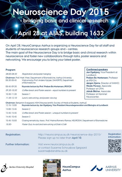 On April 28 2015, NeuroCampus Aarhus hosted a Neuroscience Day for all affiliated research labs and centres as well as for students with interest in neuroscience. By bringing basic and clinical scientists together, the organisers wished to encourage collaborations and strengthen translational neuroscience research within the NeuroCampus Aarhus research cluster.